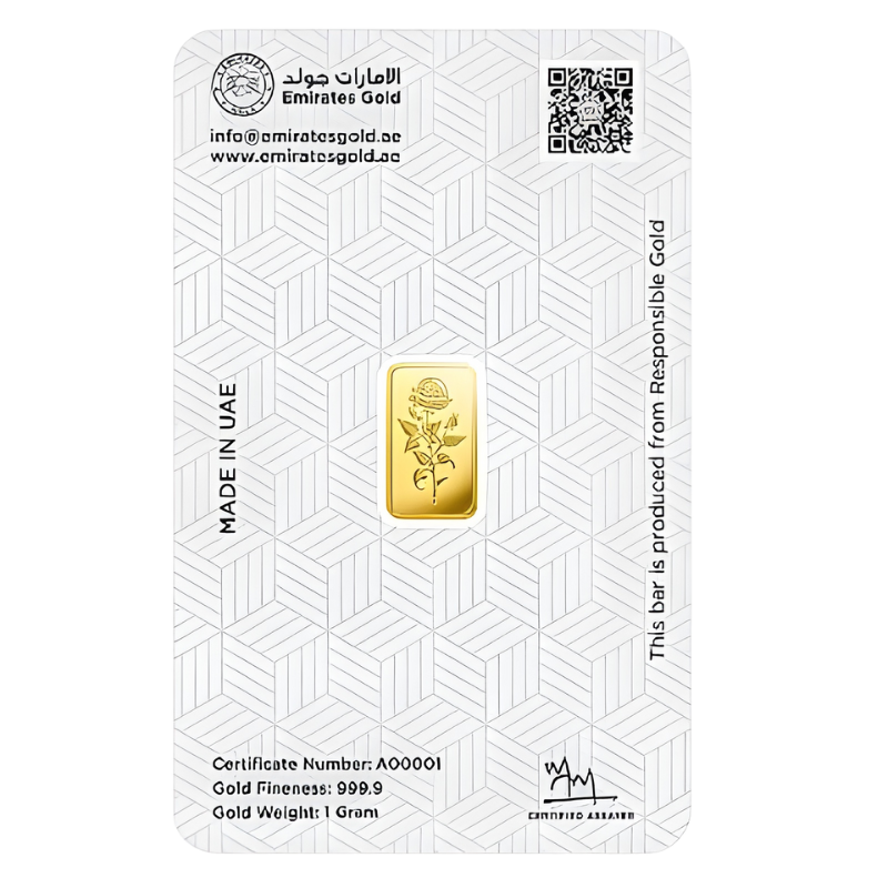 The smallest bar in the Emirates Gold range, this 1 gram investment gold bar still displays the attention to detail and craftsmanship associated with this well respected manufacturer. The front of the bar is stamped with the Emirates Gold logo together with the weight and fineness (999.9) of the bar. The reverse of the bar is beautifully decorated with a ‘Rose of Dubai’ image on a mirror finish background.